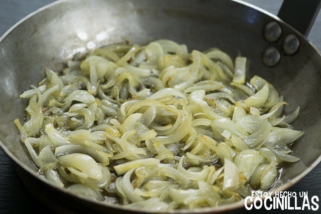 - Mientras las patatas están en el horno, en una sartén calentar un par de cucharadas de aceite de oliva y sofreír en ella la cebolla a fuego medio-bajo removiendo varias veces, para que la cebolla no se queme. (**)
