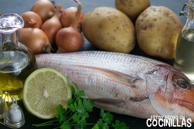 - (**) Para realizar este besugo al horno sencillo, la cebolla se cocina aparte, para asegurarse que queda bien. También se puede hornear la cebolla con las patatas, aunque hay que tener cuidado, pues se quema con facilidad.