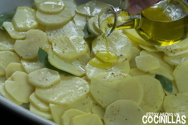 - Disponer las patatas en ella, salpimentar generosamente y añadir un par de cucharadas de aceite de oliva. Mezclar bien con las manos para que las patatas se cubran bien de aceite. Repartirlas por la bandeja para que quede una cama de patatas.
