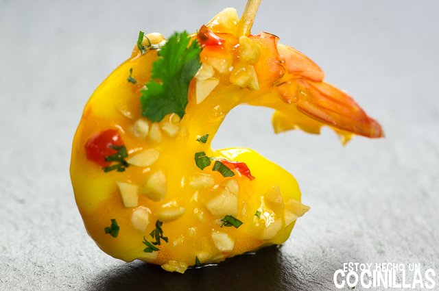 Una vez en los palillos, metemos los langostinos en el congelador 10 minutos (esto ayudará a fijar el mango). Sacamos y, uno a uno, los sumergimos en la gelatina de mango y, enseguida, espolvoreamos con cacahuete tostado y picado y cilantro picado fino. Guardamos en la nevera mínimo 2 horas para que la gelatina coja cuerpo. Para servir, echarles un poco de salsa de chile dulce por encima. Esta salsa se encuentra en la sección de comida asiática del supermercado o la puedes hacer siguiendo esta receta.