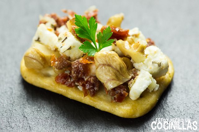 Ingredientes: 6 mini crackers, 4 tomates secos hidratados (bien escurridos y picados), 50 g de queso feta (desmigado), 15 g de nueces picadas, 1 chorrito de AOVE, orégano y unas hojas de perejil pequeñas para decorar.