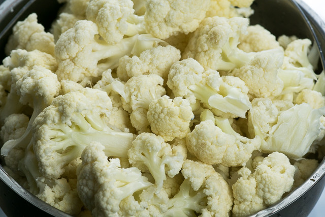 1. Cortar la coliflor sacando con cuidado las flores. Lo más fácil es darle la vuelta e ir cortando alrededor del tronco. Si hay alguna flor muy grande se puede cortar en dos o tres trozos sin problema.