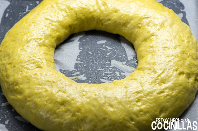 - Hornear de 18 a 20 minutos, dependiendo del horno. A mitad del horneado, cubrir el roscón para que no se dore demasiado.