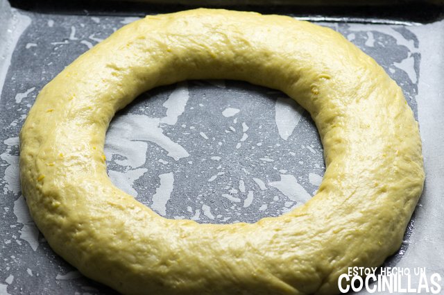 - Ahora se le puede dar la forma de roscón haciendo un agujero en el centro y estirando poco a poco, teniendo cuidado que quede más o menos del mismo grosor. Hay que dejar un agujero de unos 15 cm de diámetro para que al final no se cierre.