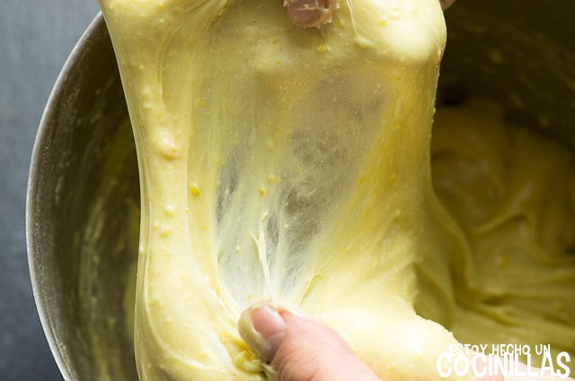 - Continuar el amasado, hasta que la masa adquiera una textura muy elástica y se pueda formar con ella una membrana casi transparente. Este paso puede tomar hasta 30 minutos o un poco más. Durante el amasado, haz pausas de 5 minutos para que la masa descanse.