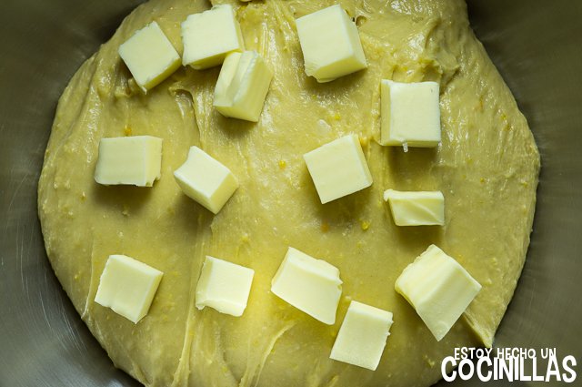 - Añadir la mantequilla cortada en cubos en dos veces, amasando hasta que esté integrada casi por completo. Al principio parecerá un desastre, pero al continuar el amasado al final acabará por integrarse.