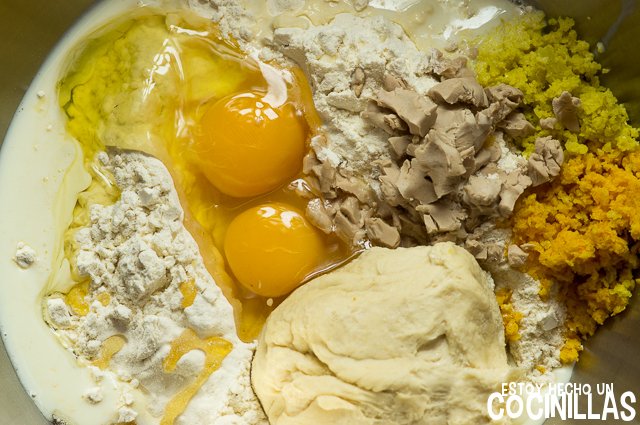 - En un bol grande, añadir el prefermento, la harina, la miel, la levadura fresca desmenuzada, los dos huevos, la ralladura de limón y de naranja, 60 g de la leche infusionada y la sal.