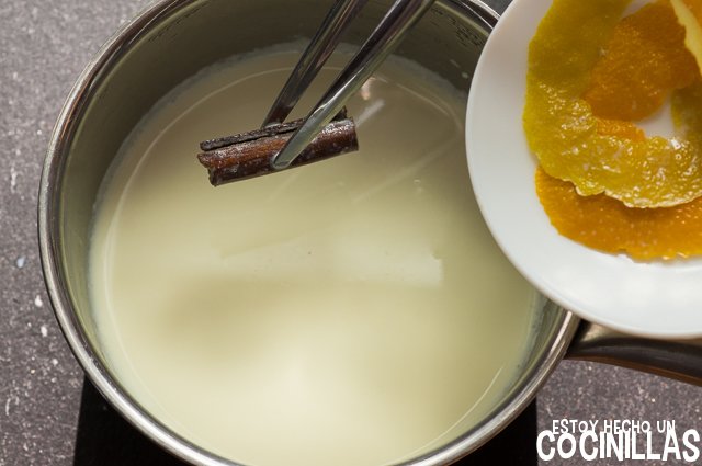 - En un cazo poner a calentar la leche con la rama de canela y la cáscara de limón y de naranja. Cuando rompa a hervir, apartar del fuego, tapar y dejar templar.
